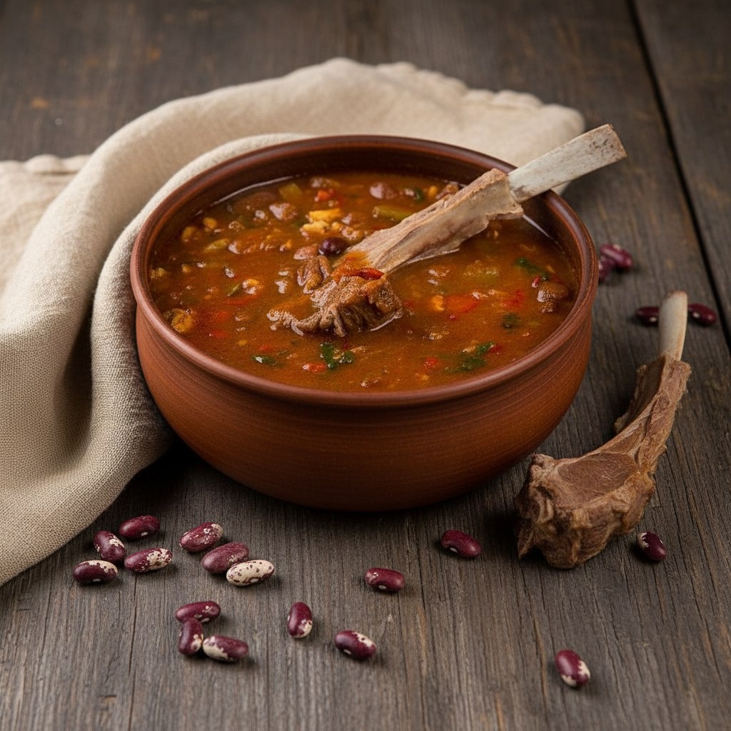 Ночь, время когда город засыпает и просыпаются "надо срочно что-то приготовить". Так и у меня. Все спят, а мне скучно, в итоге решаюсь взять какую-нибудь книгу почитать и тут мне на глаза попадается листочек написанный от руки. На нём рецепт супа, который для меня моя подруга привезла из отпуска. Ну что делать, мне надо. Вот прям ночью! ИНГРЕДИЕНТЫ ⦁ Баранья корейка 1 кг ⦁ Вода 2 л ⦁ Черный душистый перец горошком по вкусу ⦁ Корень пастернака 1/3 штуки ⦁ Гвоздика по вкусу ⦁ Перец чили 1/3 штуки ⦁ Куркума по вкусу ⦁ Мускатный орех 1/6 штуки (примерно) ⦁ Красная фасоль 300 г ⦁ Курдюк 60 г ⦁ Помидоры 160 г ⦁ Грецкие орехи 60 г ⦁ Соленые огурцы 160 г ⦁ Лук репчатый 130 г ⦁ Сладкий перец 130 г ⦁ Хмели-сунели 1 чайная ложка (примерно) Приготовление: Замочите фасоль в холодной воде на пару часов, затем отварите до мягкости. Откиньте на дуршлаг, чтобы стекла вода, и измельчите фасоль блендером до состояния однородного пюре. Пастернак обожгите над открытым огнем или слегка поджарьте на сухой с