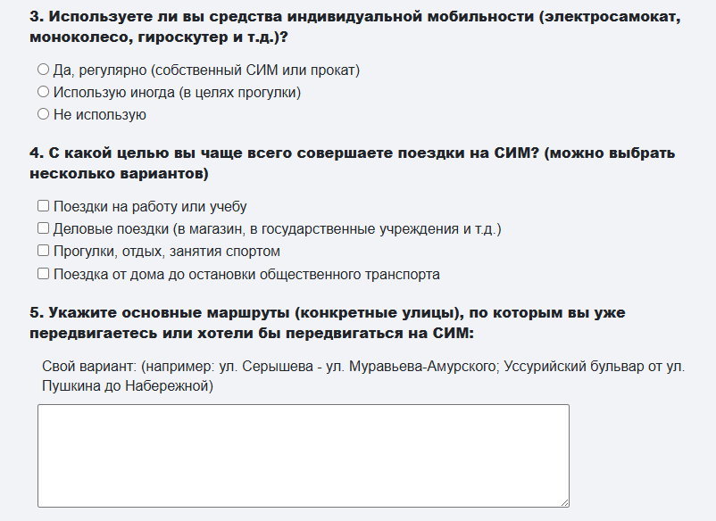 Городские власти с прошлого года плотно работают над идеей ужесточить контроль за самокатчиками и сделать так, чтобы СИМ не мешали пешеходам и автомобилистам, но при этом имели собственную инфраструктуру: велодорожки, парковки и так далее. Сейчас к решению этих вопросов чиновники решили привлечь хабаровчан и провести опрос, чтобы люди высказались: где самокаты надо запретить, а где, наоборот, создать для них необходимую среду. Анкета размещена на сайте мэрии в разделе «Жителям города». Тех, кто пользуется средствами индивидуальной мобильности, в первую очередь просят рассказать, по каким улицам они бы хотели передвигаться и с какой целью: просто веселья ради или чтобы добраться по делам или на работу. Интересует также мэрию вопрос, нужно ли вообще развивать инфраструктуру для СИМ, и если да, то где именно она требуется в первую очередь. Среди вариантов - центральные улицы; парки, скверы, набережные; жилые микрорайоны; соединительные маршруты между районами города (магистрали). Также ха