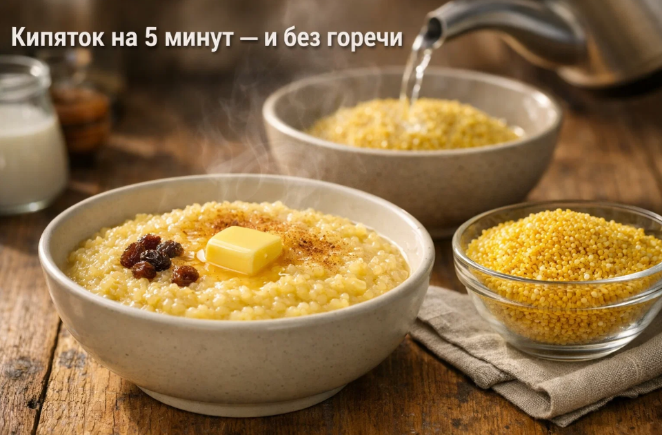 Пшённая каша незаслуженно забыта многими современными хозяйками. Одна из причин — как раз та самая горечь, которая отпугивает тех, кто хоть раз с ней столкнулся. Но теперь вы знаете, что проблема решается буквально за минуту: достаточно залить крупу кипятком перед варкой.