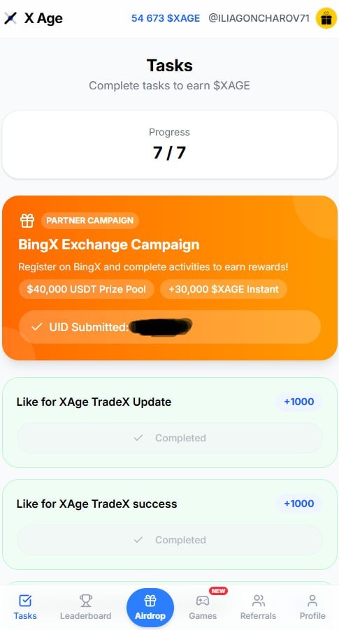 🗣 Стартовала кампания, общий призовой фонд 40K USDT и 35K XAGE (как понял каждому участнику) 👉 Переходим по ссылке, делаем авторизацию через твиттер и выполняем все задания, также можно нажать - Click to Get Started и указать UID с биржи BingX 📱Схемы Заработка 📱VK-чат 📱TG-канал 📱TG-чат