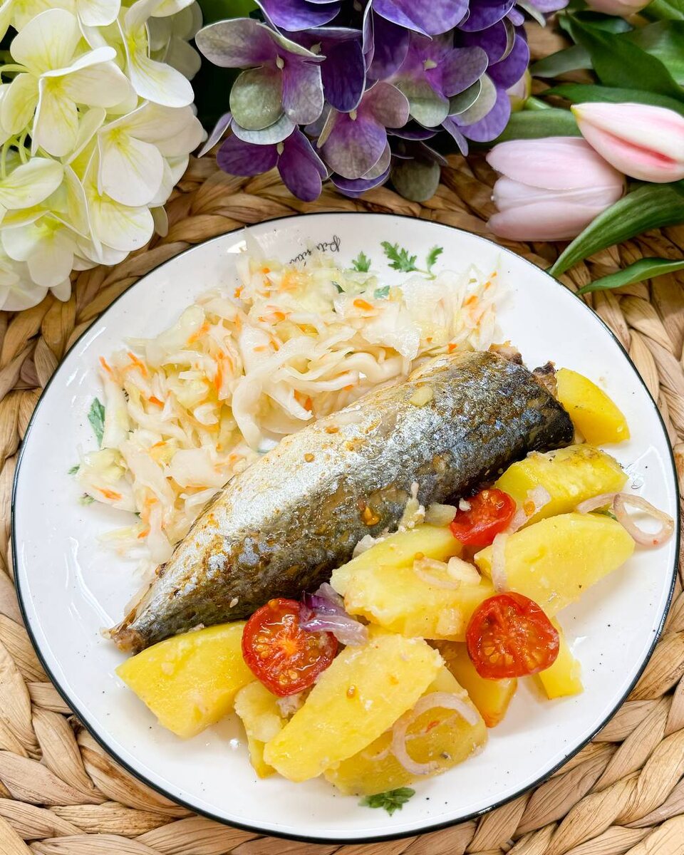 А порция отварной картошки с сельдью/ скумбрией и квашеной капустой - это огромная польза для организма.