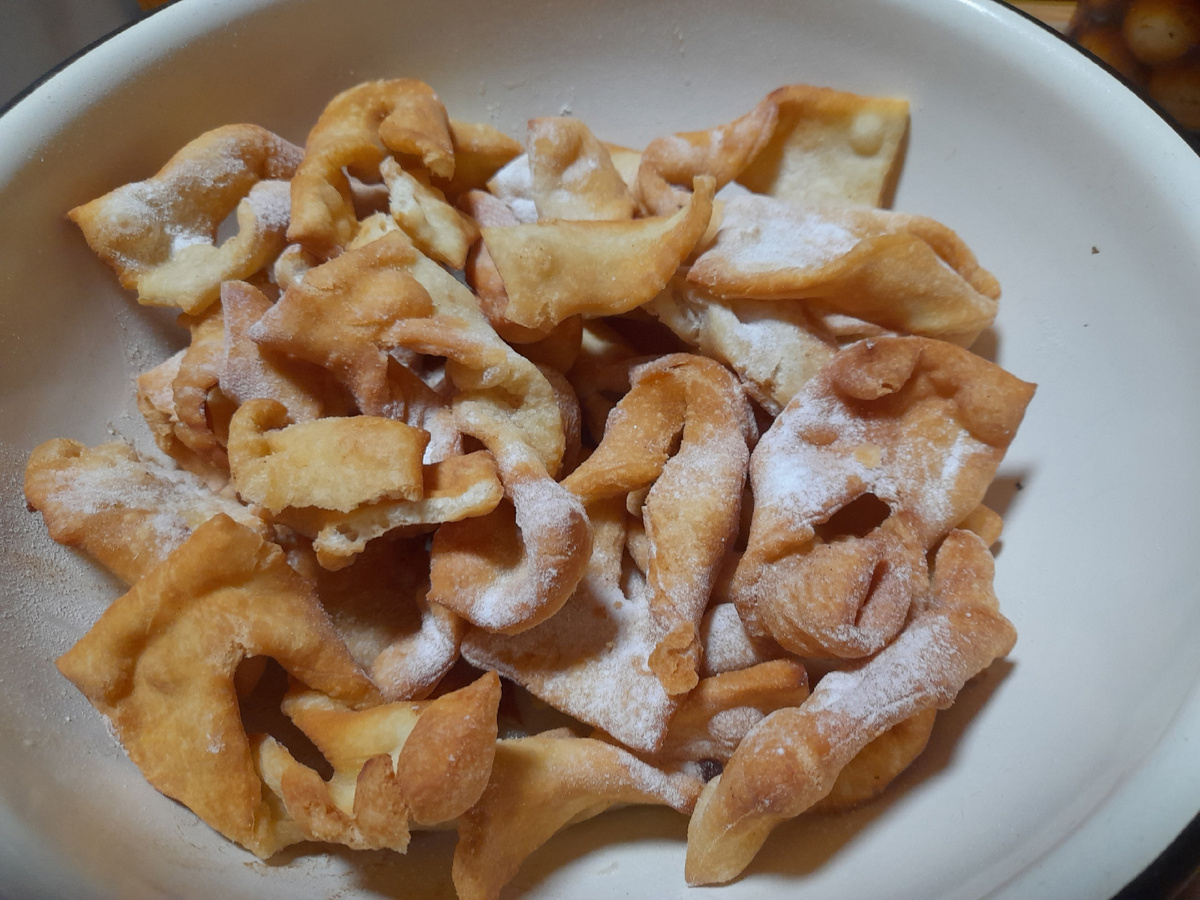 Наконец-то нашла рецепт теста для этого вида выпечки, любимой когда-то, в далёком детстве... Мама не умела печь торты - как-то не принято было это в прошлом, зато пекла замечательные пироги, разные, с разнообразной начинкой: мясной, рыбной, грибной, овощной, сладкой... Не очень часто, обычно по праздникам, делала мама хворост. До чего же он был вкусным - просто таял во рту! Не знаю и не узнаю теперь уже, на каком масле он жарился - то ли на каком-то комбижире, как раньше это называлось, то ли на сливочном масле, ну точно не на подсолнечном, поскольку в те времена растительное масло было только подсолнечное, ароматное и точно не для жарки. Скорее всего всё же на сливочном, по этой причине и было это редким событием в жизни. Вот бабушка, знаю точно, всю выпечку делала на сливочном масле. Помню, как она укладывала маленькие пирожки со сладкой начинкой в форму, залитую растопленным сливочным маслом - получалась "дружная семейка", действительно тающая во рту! Сейчас у нас есть рафинированн