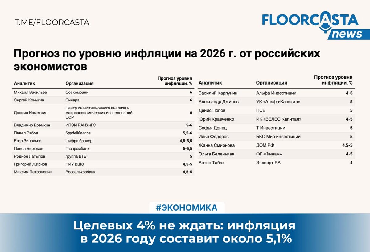 % Консенсус-прогноз «Ведомостей», составленный на основе мнений 19 экономистов, показывает, что по итогам 2026 года инфляция в России, вероятно, не достигнет целевого уровня в 4%, составив в среднем около 5,1%. ⚡️ Прогноз по кварталам: I квартал: Рост цен может ускориться до 6,2–6,6% из-за влияния повышения НДС, индексации тарифов и акцизов. II полугодие: Темпы начнут замедляться, и к декабрю инфляция может опуститься до диапазона 5–5,5%. 💡 Прогноз по ставке: В базовом сценарии средняя ключевая ставка ЦБ в 2026 году составит 13–15%. Резкого смягчения не ожидается, и в случае новых шоков регулятор может удерживать ставку ближе к 14% к концу года. ✍️ Прогноз рисует картину сложного года: резкий скачок цен в первом квартале может подстегнуть «покупательскую лихорадку», а последующее замедление — привести к выравниванию спроса. ✒️✒️✒️✒️✒️✒️ на @floorcasta