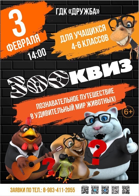 ! ⭕ 3 февраля 🕑 14.00 🐺 Это познавательно-развлекательная программа на тему удивительного мира животных. 🐵 Квиз состоит из шести захватывающих раундов, где ребята могут продемонстрировать свои знания о животном мире, проявить сообразительность и смекалку. После каждого раунда команды сдают бланки на проверку, таймер на сдачу бланков – 30 секунд. За каждый правильный ответ команда зарабатывает – 1 балл. Побеждает команда, набравшая по итогу всей игры большее количество баллов. Цена билета 300 рублей. Тел. для связи: 89834112055, Дарья.