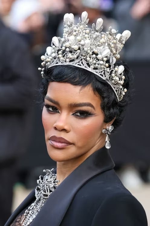 👠 Актриса Тейяна Тейлор вчера на Парижской неделе моды в копиях украденных из Лувра королевских украшений – жемчужной тиаре императрицы Евгении и броши "Бриллиантовый бант" в исполнении Schiaparelli