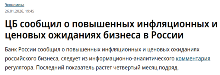Банк России опубликовал первые в 2026 году данные по инфляционным ожиданиям. Там пока нет данных от населения, но есть от бизнеса (собственно, бизнес и формирует цены, а население, что бы оно ни ожидало, вынуждено с ними жить, хотя инфляционные ожидания населения, как правило, близки к ожиданиям бизнеса). Итак, во-первых, инфляционные и ценовые ожидания бизнеса растут уже четыре месяца подряд (несмотря на то, что официальная инфляция по Росстату к концу 2025 года сильно снизилась). Во-вторых, конкретно в январе они показали максимальный скачок за эти четыре месяца (здесь уже, собственно, и как инфляция по Росстату). Индикатор ценовых ожиданий бизнеса, который измеряется в пунктах, в январе составил 30,1 пункта, тогда как в декабре этот показатель достигал 25,2 пункта. За месяц он подскочил более на 20%. Это соответствует среднему ожидаемому предприятиями приросту цен на следующие 3 месяца в годовом выражении 10,4% (после