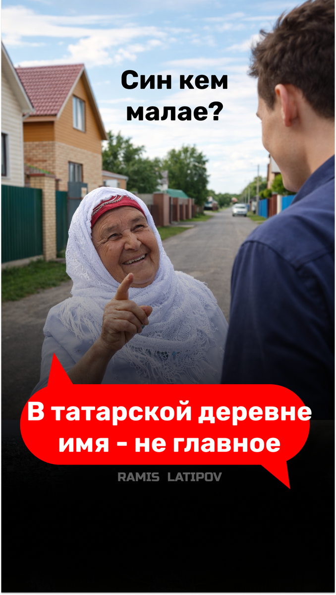 лавное Кем малае соң бу? «Чей это сын?» – так спрашивают друг-друга деревенские бабушки. Так спросили и про меня в деревне Токаево – Тукай Комсомольского района Чувашии. Это такое интересное явление: когда приезжаешь в деревню, никогда не задают вопрос – как тебя зовут. Если правду говоря, ты в татарской деревне никому не нужен и твое имя никого не колышит и ничего не значит. И даже твою фамилию никто спрашивать не станет. Они спросят – чей ты сын или чья ты дочь: син кем малае, син кем кызы. Как вот для немцев при официальном обращении важна фамилия, так же для татар важно, чей ты сын. Ты можешь хоть сказать: меня зовут хоть кем – пока они не узнают, чей ты сын, с тобой разговор неинтересен. А когда уж узнают, тогда спросят: ә син ни атлы? Буквально – «а у тебя какая лошадь?» Ну бабульки не интересуются, конечно, породой лошади. Дело в том, что у слова ат – лошадь – есть и другое значение: имя человека. Видимо, в давние времена для татарина его лошадь была практически его именем. У т