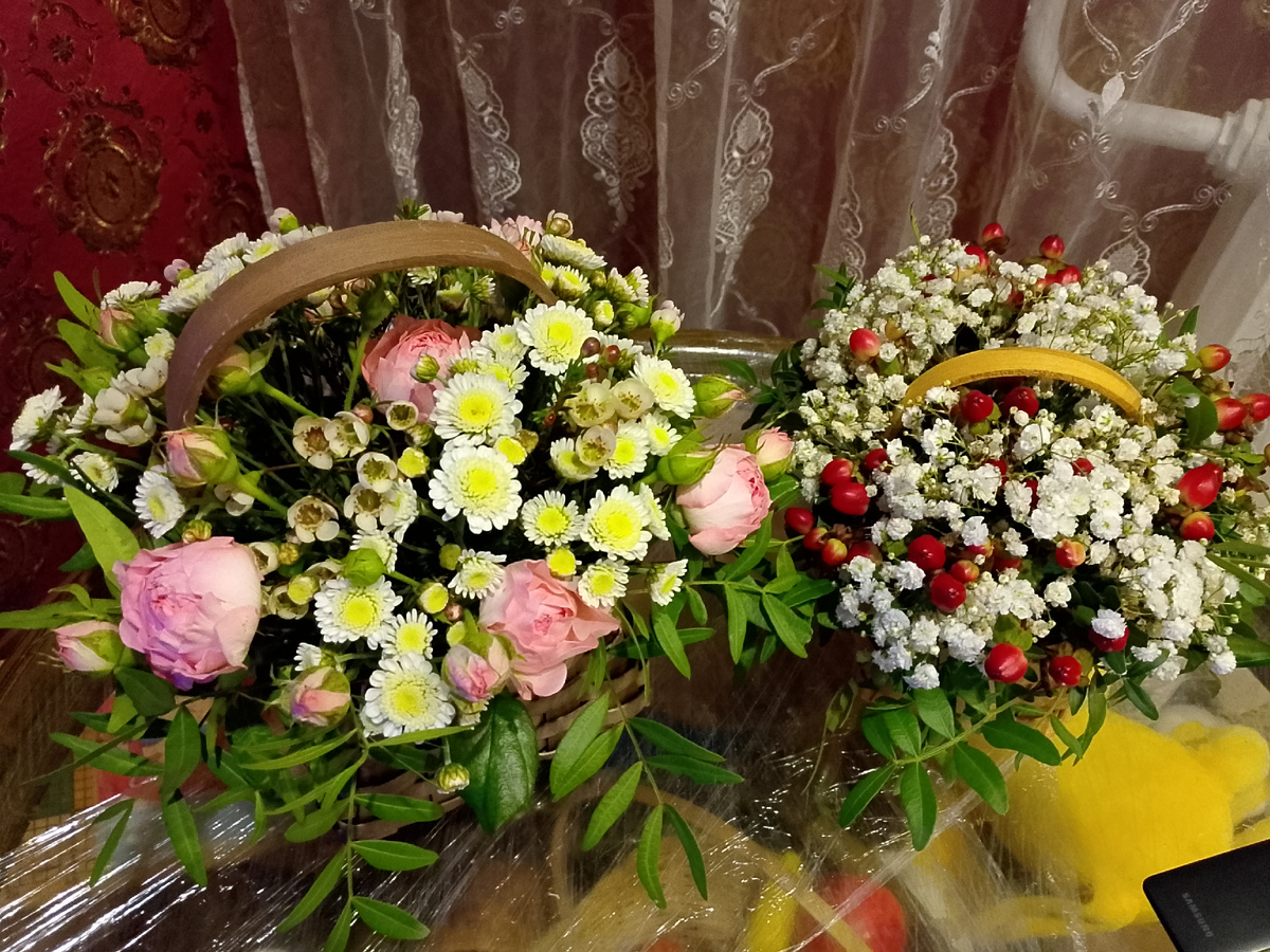 Утром привезли два букетика в корзинках. От бабушки и дедушки, от прабабушки.