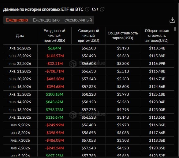 🔸26 января спотовые ETF на биткоин зафиксировали общий чистый приток средств в размере $6,84 млн, прервав пятидневную серию чистого оттока