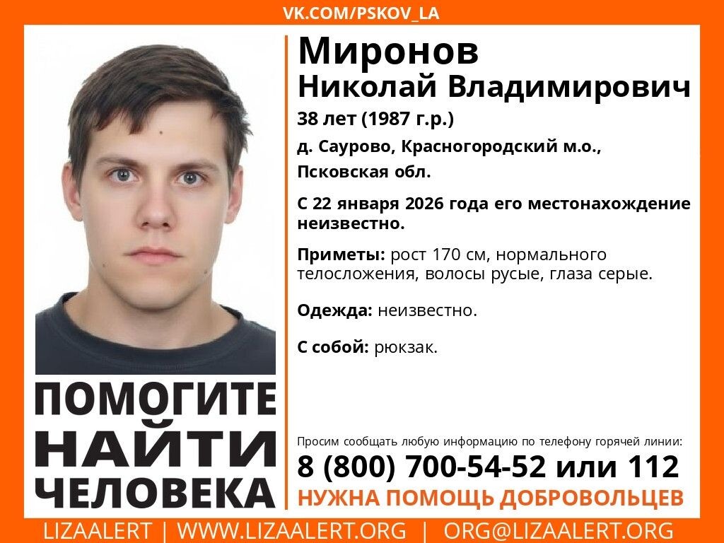 🚨 В Красногородском округе Псковской области разыскивают пропавшего мужчину Николая Владимировича, 38 лет. 📌 Он проживает в деревне Красногородского муниципального округа, его местонахождение неизвестно с 22 января 2026 года. 📞 Информацию о пропавшем можно сообщить по телефону: +7 (921) 001-42-13 (инфорг Кристина, позывной «Саламандра»). 👉ВЛуки.ру