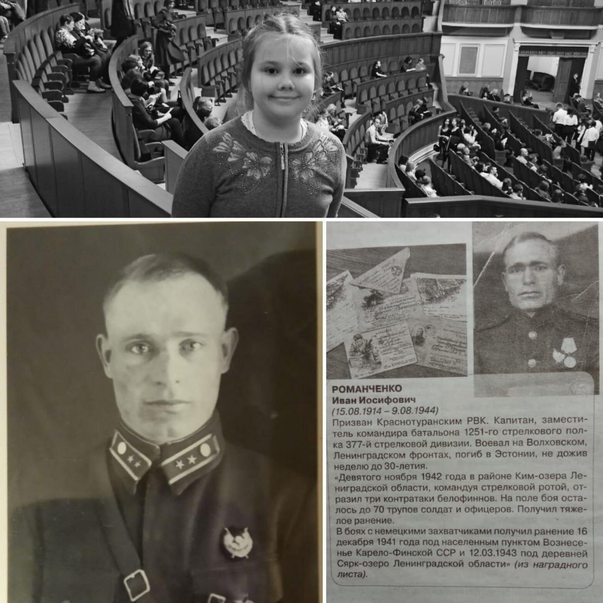 блокадного Ленинграда. Вот что она рассказывает: ✏️27 января 1944 года. Снята блокада города Ленинграда . Какими великими силами бойцы Волховского , Ленинградского фронтов , Балтийского флота и участия партизан , отстояли наш исторический город . ВСПОМНИМ О тех , кто командовал ротами , Кто умирал на снегу . . . Кто в Ленинград пробирался болотами Горло ломая врагу . . . РОМАНЧЕНКО ИВАН ИОСИФОВИЧ Капитан , заместитель командира батальона , 1251 стрелкового полка , 377 - й стрелковой дивизии . ( родом из с. Бузуново , Краснотуранского района ) Папа мой . Он геройски сражался на поле брани во время ВОВ в составе Волховского потом Ленинградского фронтов . Сняв блокаду г .Ленинграда , бойцы Ленинградского фронта двинулись далее освобождать от фашистских захватчиков нашу Родину СССР . Но не пришлось моему папе праздновать день Победы в 1945 году . Он погиб в Эстонии 9 августа 1944 г ., отдав свою жизнь , за нашу счастливую жизнь . На фото его праправнучка , она гордится подвигами воинов В