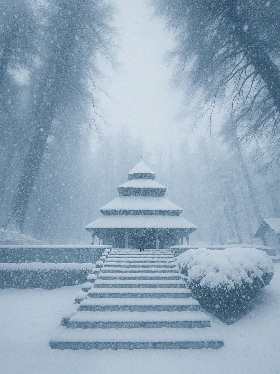 Под снегом оказался и уникальный деревянный храм Хидимбы в Манали. Хидимба — ракшаси, обитающая в лесах Гималаев, сестра демона Хидимбы или Бакасауры — версии разнятся. В отличие от брата, она не была агрессивна: увидев братьев Пандавов, Хидимба влюбляется в Бхиму. Бхима убивает её брата, после чего Хидимба принимает человеческий облик и становится его женой по гандхарва-вивахе — союзу без ритуалов. Их сын — Гхатоткача, один из самых могущественных воинов Махабхараты, обладающий магическими и демоническими силами. В Химачал-Прадеше Хидимба почитается не как демон, а как местная богиня-хранительница, связанная с дикой природой и лесами, женской силой и защитой местности и рода, и даже как одна из грозных форм Деви.