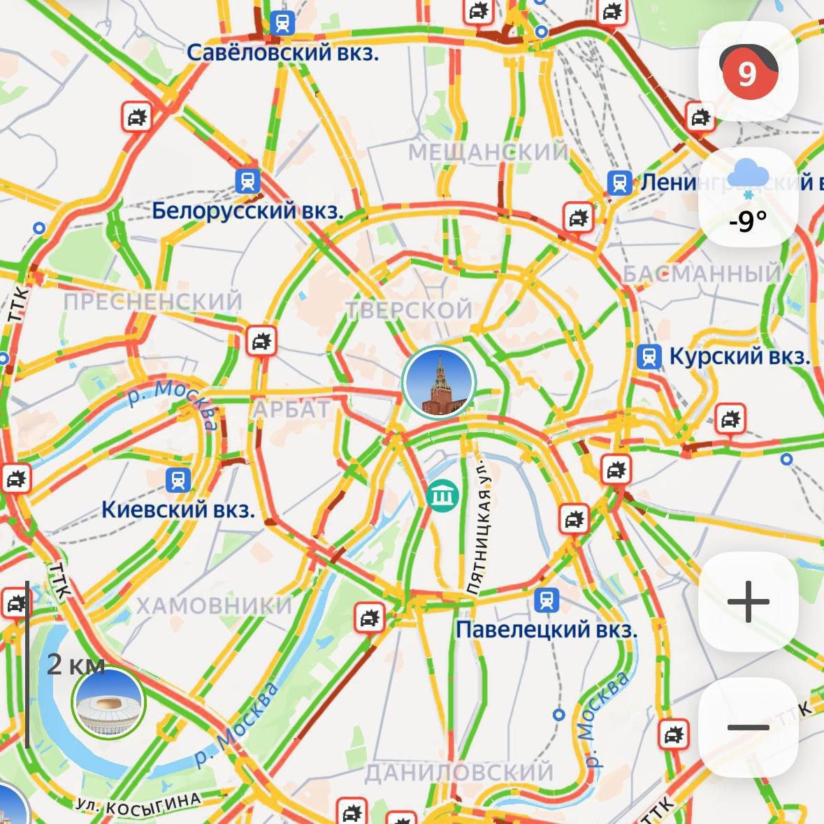 Москва встала в 9-балльные пробки из-за сильнейшего снегопада. На дорогах множество ДТП.