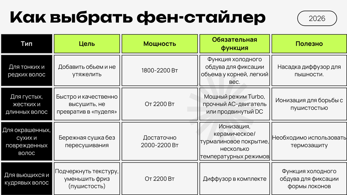 Важно: Высокая мощность без контроля температуры может вредить волосам. Всегда используйте термозащиту.