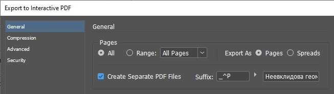 При экспорте pdf из индизайна есть возможность выгружать файл постранично. Это может быть нужно, например, если вас попросили сделать 50 именных дипломов, при этом все дипломы будут печатать в разных местах. При экспорте отдельных страничек вы получите печатные файлы с абсолютно одинаковыми настройками, а главное — быстро! Для этого включаем галочку Create Separate PDF Files, а в русской версии, скорее всего, так и будет написано: Экспортировать как отдельные файлы.