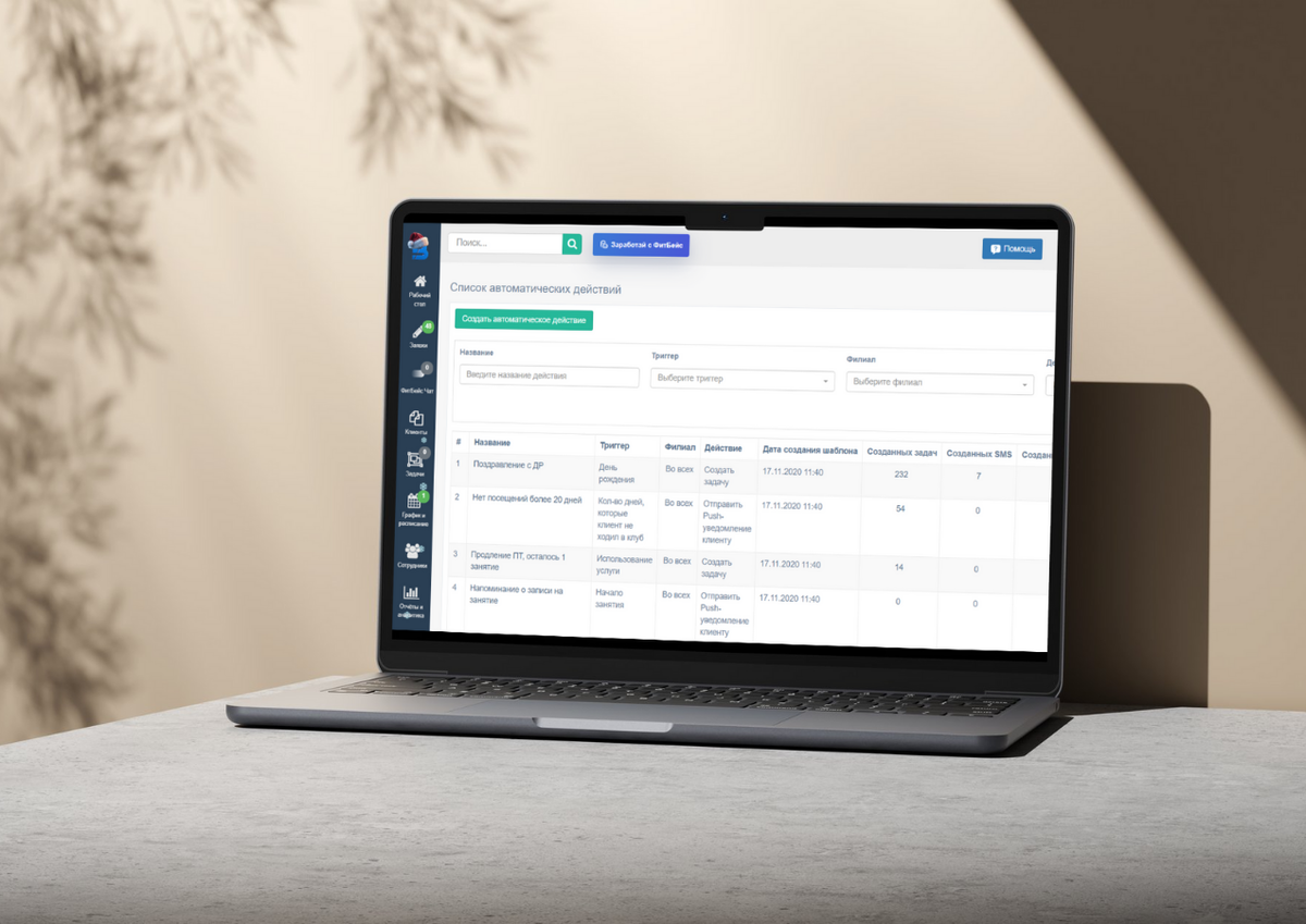 - Триггер (событие) — что должно случиться, чтобы запустить правило: создание клиента, покупка, окончание абонемента, отсутствие посещений N дней, изменение статуса записи, отсутствие движения по воронке и т.д.