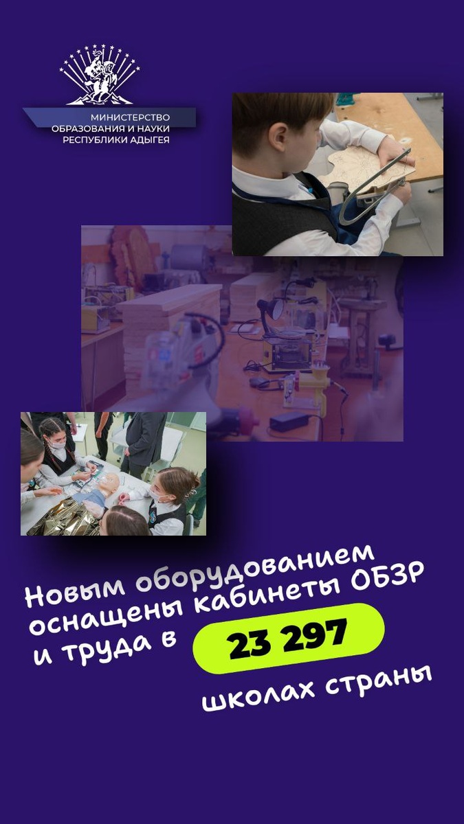 защиты Родины» (ОБЗР) и «Труд (технология)» в 86 субъектах Российской Федерации. Перечень нуждающихся в оснащении школ был сформирован на основе принципа целевой поддержки, помощь была оказана каждой школе. В Республике Адыгея новое оборудование было установлено в 103 школах. Для кабинетов ОБЗР поставлены тактические тренажеры, макеты для изучения гражданской обороны и противодействия терроризму, а также средства индивидуальной защиты. Для предмета «Труд (технология)» приобретены многофункциональные станки (включая токарные и лазерные), наборы электроинструментов и комплекты для занятий робототехникой. Модернизация образовательных пространств продолжается: уже в этом году по всей стране начнется оснащение кабинетов музыки, изобразительного искусства и физики. #нацпроектмолодежьидети Минпросвещения России