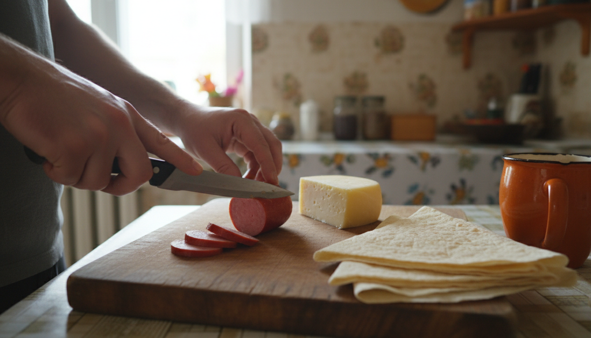 🥣 Мойка: 🟢 (только доска и сковорода, справимся) 🛒 На столе: Нарезал колбасу и сыр. Если есть время — на терке, если сил нет — просто тонкими ломтиками. Лаваш режу на широкие полоски. Кладу начинку на край и сворачиваю плотным конвертиком. Кстати, в моем Telegram-канале всё еще короче и по делу, а здесь, в Дзене, разберем детали. Разогреваю сковороду. Тут важный момент: я кидаю кусочек сливочного масла. Можно и на растительном, но на сливочном вкус получается тот самый — домашний, из детства. А вы бы сейчас продолжили готовить или всё-таки заказали доставку? Я личн