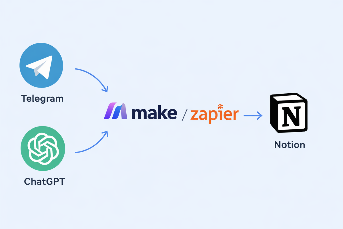 Пошаговый гайд для тех, кто хочет за 1 вечер создать личного ассистента, который будет собирать данные, напоминать и структурировать. Представьте: вы кидаете голосовое сообщение в Telegram: «Купить молоко и записаться к стоматологу», а через секунду это оказывается задачей в вашем Notion-планере. Или ChatGPT анализирует статью по вашей ссылке и кладет саммари в базу знаний. Это не магия, это автоматизация на стыке нейросетей и no-code. Собираем пайплайн. Цель: Создать систему, где через Telegram в Notion добавляются умные, обработанные ChatGPT заметки. Что нам понадобится (всё есть в бесплатных тарифах): ШАГ 1: Готовим «приёмник» в Notion ШАГ 2: Настраиваем «мозг» в Make (бывший Integromat) ШАГ 3: Добавляем обработку ChatGPT ШАГ 4: Отправляем результат в Notion Запускаем сценарий и тестируем!
