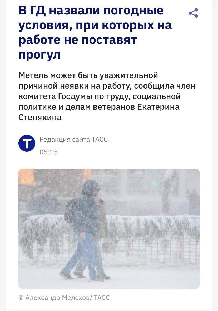 ! ❄️ Депутат Госдумы Стенякина заявила, что россияне вправе не выходить на работу при метелях и снежных заносах. 🤔 Если МЧС, синоптики или дорожные службы официально предупредили о непогоде, работодатель не может считать это прогулом. 🚀Подпишись на Telegram канал Дрожжино