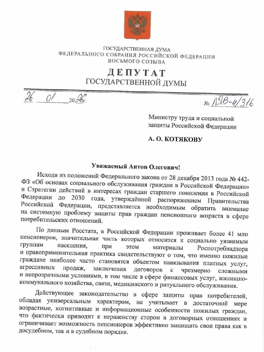 В России более 41 миллиона пенсионеров. Многие из них живут на скромную пенсию. Для таких людей даже несколько тысяч рублей от навязанной услуги — это удар по бюджету. Чаще всего жертвами недобросовестных продавцов становятся именно пожилые. Им навязывают ненужные страховки в банках, платные подписки и даже ритуальные услуги. Причем число таких случаев только растет. Пенсионеры — главная цель, потому что им сложнее разобраться. Они редко доходят до суда или жалуются в Роспотребнадзор. В итоге теряют деньги, а компании практически не несут за это ответственности. ‼️ Закон о защите прав потребителей не учитывает возрастные особенности. Предложила министру труда Антону Котякову создать «потребительский стандарт для пенсионеров»: 🔹Запрет на дополнительные платные услуги без отдельного письменного и четко зафиксированного согласия пенсионера. 🔹Презумпция незаконности услуги, если такое согласие отсутствует. 🔹Повышенные штрафы за обман или давление на пенсионеров. 🔹Простые договоры: к
