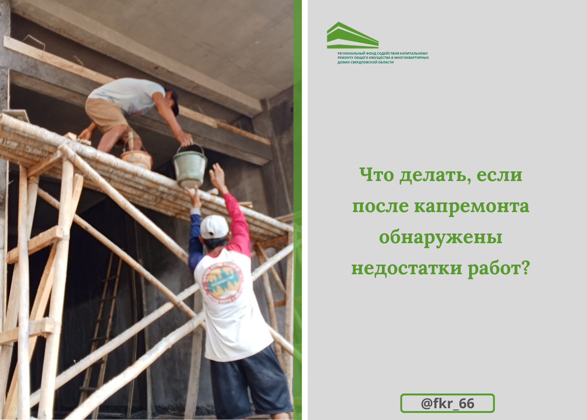 ВОПРОС: Добрый день! После капитального ремонта обнаружил протечки на системе холодного водоснабжения. Что мне делать в этом случае? ОТВЕТ: Здравствуйте! После проведения капитального ремонта и подписания акта сдачи-приемки выполненных работ начинает течь гарантийный срок, который составляет 5 лет. Для того, чтобы в рамках гарантии подрядная организация исправила выявленные недостатки, Вам надо обратиться в управляющую организацию для составления акта осмотра. Далее необходимо написать официальное обращение в адрес Фонда и приложить к нему паспорт, свидетельство о праве собственности, указанный акт и фотографии проблемного участка. Отметим, что обратиться в Фонд в рамках гарантии может управляющая организация. После регистрации Вашего обращения будет организован комиссионный выезд по недостаткам капитального ремонта. В этом случае с Вами свяжутся специалисты Фонда и уточнят информацию о времени и дате выезда. #ФКР66 #АктуальныйвопросФКР66 #гарантия #региональнаяпрограмма #капремонтМКД