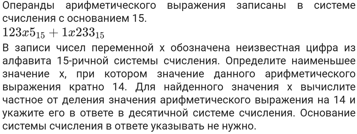 ΠΡΠ° ΡΡΠ°ΡΡΡ ΠΏΠΎΡΠ²ΡΡΠ΅Π½Π° Π·Π°Π΄Π°Π½ΠΈΡ 14 ΠΠΠ ΠΏΠΎ ΠΈΠ½ΡΠΎΡΠΌΠ°ΡΠΈΠΊΠ΅, Π² ΠΊΠΎΡΠΎΡΠΎΠΌ ΡΡΠ΅Π±ΡΠ΅ΡΡΡ Π½Π°ΠΉΡΠΈ Π½Π΅ΠΈΠ·Π²Π΅ΡΡΠ½ΡΡ ΡΠΈΡΡΡ X Π² Π·Π°ΠΏΠΈΡΠΈ ΡΠΈΡΠ»Π° Π² Π·Π°Π΄Π°Π½Π½ΠΎΠΉ ΡΠΈΡΡΠ΅ΠΌΠ΅ ΡΡΠΈΡΠ»Π΅Π½ΠΈΡ, ΠΏΡΠΈ ΡΡΠ»ΠΎΠ²ΠΈΠΈ, ΡΡΠΎ Π·Π½Π°ΡΠ΅Π½ΠΈΠ΅ Π°ΡΠΈΡΠΌΠ΅ΡΠΈΡΠ΅ΡΠΊΠΎΠ³ΠΎ Π²ΡΡΠ°ΠΆΠ΅Π½ΠΈΡ ΠΊΡΠ°ΡΠ½ΠΎ ΠΎΠΏΡΠ΅Π΄Π΅Π»ΡΠ½Π½ΠΎΠΌΡ ΡΠΈΡΠ»Ρ. ΠΡΠ»ΠΈ Π²Ρ Π½Π΅ ΡΠΈΡΠ°Π»ΠΈ ΡΠ°Π·Π±ΠΎΡΡ ΠΏΡΠΎΡΠΎΡΠΈΠΏΠΎΠ² ΠΏΠ΅ΡΠ²ΠΎΠ³ΠΎ ΡΠΈΠΏΠ° ΡΡΠΎΠΉ Π·Π°Π΄Π°ΡΠΈ, ΡΠΎ Π½Π°ΡΡΠΎΡΡΠ΅Π»ΡΠ½ΠΎ ΡΠ΅ΠΊΠΎΠΌΠ΅Π½Π΄ΡΡ ΠΎΠ·Π½Π°ΠΊΠΎΠΌΠΈΡΡΡΡ Ρ Π½ΠΈΠΌΠΈ Π² ΠΌΠΎΠΉ ΡΡΠ°ΡΡΠ΅. Π’Π°ΠΊΠΈΠ΅ Π·Π°Π΄Π°ΡΠΈ ΠΊΠ°ΠΆΡΡΡΡ ΡΠ»ΠΎΠΆΠ½ΡΠΌΠΈ ΠΈΠ·-Π·Π° Π½Π΅ΠΏΡΠΈΠ²ΡΡΠ½ΠΎΠΉ ΡΠΎΡΠΌΡΠ»ΠΈΡΠΎΠ²ΠΊΠΈ. ΠΠΎ Π½Π° ΡΠ°ΠΌΠΎΠΌ Π΄Π΅Π»Π΅ β ΡΡΠΎ ΡΠΈΡΡΡΠΉ ΠΏΠ΅ΡΠ΅Π±ΠΎΡ Ρ ΠΏΡΠΎΠ²Π΅ΡΠΊΠΎΠΉ Π΄Π΅Π»ΠΈΠΌΠΎΡΡΠΈ. Π Π΅ΡΠ»ΠΈ Π²Ρ Π·Π½Π°Π΅ΡΠ΅, ΠΊΠ°ΠΊ ΠΏΡΠ°Π²ΠΈΠ»ΡΠ½ΠΎ ΠΎΡΠ³Π°Π½ΠΈΠ·ΠΎΠ²Π°ΡΡ ΡΡΠΎΡ ΠΏΠ΅ΡΠ΅Π±ΠΎΡ, ΡΠ΅ΡΠ΅Π½ΠΈΠ΅ Π·Π°ΠΉΠΌΡΡ ΠΌΠ΅Π½Π΅Π΅ Π΄Π²ΡΡ