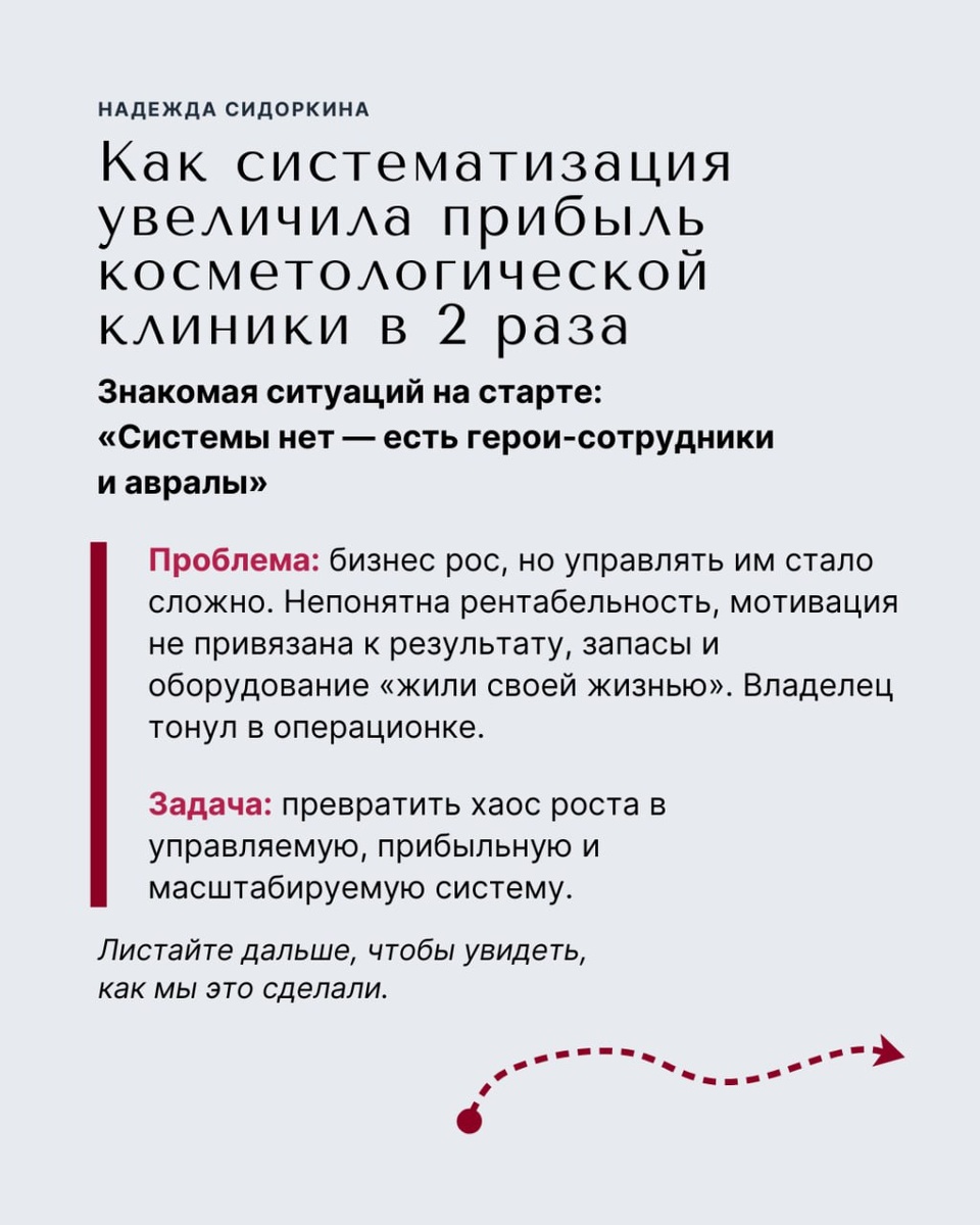 Как систематизация увеличила прибыль косметологической клиники в 2 раза 8 месяцев я работала с косметологической клиникой из Армении. Об этом моём первом международном клиенте писала здесь «Системы нет — есть герои-сотрудники и авралы» — знакомая картина? Именно с ней столкнулась клиника, обратившись к нам за помощью. С этой клиникой я работала в рамках сформированной команды экспертов, которая комплексно подходит к решению таких задач. В команде была я, маркетолог и опытный управленец из косметологии. Поэтому работа шла по нескольким направлениям: управленческий учёт, оцифровка бизнеса, маркетинг, продукт, персонал, продажи. Итак. 🤩Проблема: бизнес рос, но управлять им стало сложно: непонятна рентабельность процедур, мотивация персонала не привязана к результату, запасы и оборудование «жили своей жизнью». Владелец тонул в операционке, не имея ясной финансовой картины. 🤩Задача: превратить хаос роста в управляемую, прибыльную и масштабируемую систему. Что мы сделали за 8 месяцев