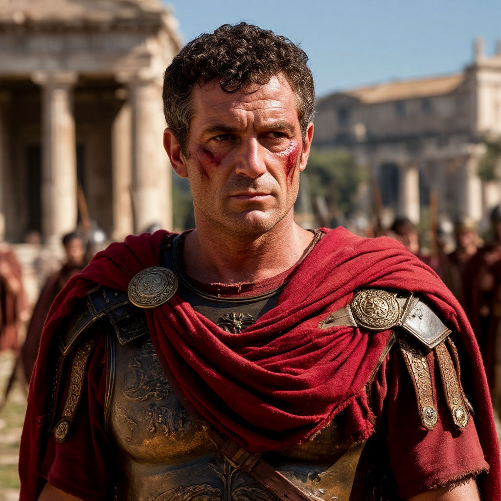 Публий Корнелий Сципион в свои двадцать пять лет был каноном римской аристократической красоты тех лет. Его рост, заметно превышающий средний сразу выделял его в толпе. Тело, лишенное грубой мускулатуры плебея было упругим, жилистым и выносливым. Плечи, широкие от метания дротиков и управления боевым конем, держались с исключительной прямотой, ни тени сутулости, ни намека на расслабленность. Лицо напоминало мастерски выполненный портрет. Правильный овал лица, резко очерченные, почти режущие скулы, тяжелый, квадратный подбородок. Кожа, загоревшая под италийским солнцем военных походов, была гладкой, но уже начинала хранить отпечаток благородного рода, в виде двух вертикальных складок между бровей. Эти заломы, неглубокие, но четкие, как насечки на мече, выдавали привычку к постоянной, концентрации. Нос с высокой, мощной переносицей и характерным, изящным изгибом, напоминающим клюв орла. Этот профиль мог бы показаться через чур суровым, если бы не живые, серьезные, но не злые глаза. Широко поставленные, под густыми, темными бровями, они были изменчивого цвета, где-то между серым и зеленым. Его волосы, темно-каштановые, с легким медным отливом на солнце, были коротко и практично острижены, открывая высокий лоб и затылок. Но в моде времени еще жила тень старого обычая, его челюсть и сильный подбородок обрамляла короткая, густая, тщательно подстриженная борода. Длинные, изящные пальцы патриция, способные вести тончайшую стилусом по воску, ладони, покрытые твердыми, желтоватыми мозолями у оснований пальцев от постоянного трения поводьев и рукояти меча. А на тыльной стороне правого предплечья, чуть ниже локтя, жил бледный, узкий шрам, первый урок, преподанный галльской секирой. Обычно он был одет в безупречную, снежно-белую тунику с двумя тончайшими пурпурными полосками. На его левой руке, на фаланге безымянного пальца, тяжело покоился простой, лишенный украшений железный перстень-печатка рода Корнелиев.