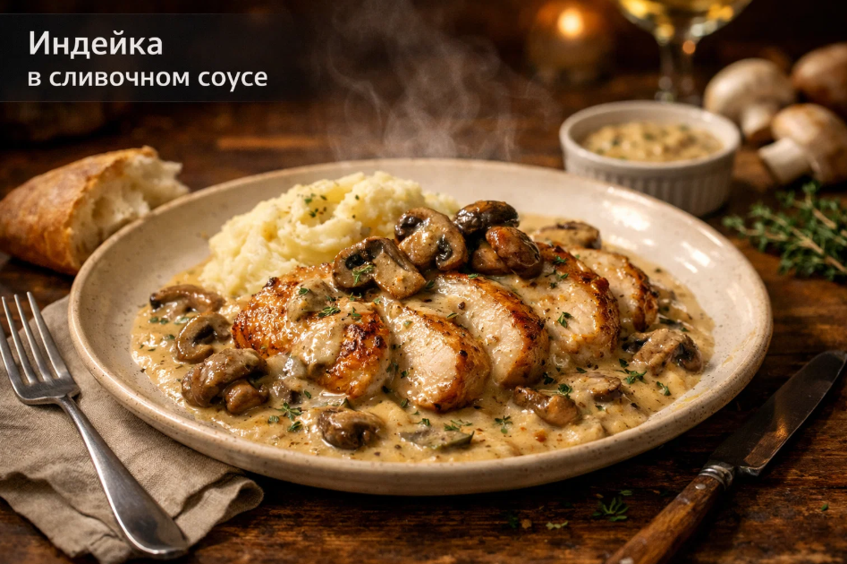 Многие скажут: зачем усложнять, можно ведь приготовить то же самое с куриной грудкой. Можно. Но результат будет совсем другим. Индейка обладает более насыщенным вкусом, мясо у неё плотнее, но при этом остаётся нежным, если правильно приготовить. Куриная грудка в сливочном соусе часто получается пресноватой, теряется на фоне сливок и грибов. Индейка же держит характер, её вкус чувствуется даже через густой соус.