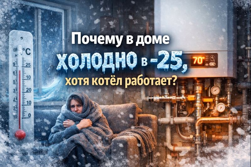 Тест-драйв холодами Каждую зиму повторяется один и тот же сценарий. На улице −20…−25, котёл гудит без перерыва, батареи горячие, а в доме ощущение, будто тепло куда-то утекает. В тапках холодно, у окон тянет, ночью хочется добавить ещё пару градусов. Первая мысль почти у всех одна: «Котёл слабый. Надо было брать мощнее». На практике в 80% случаев проблема не в котле. Дом просто не умеет удерживать тепло. Тёплый дом работает как термос: один раз нагрел — и он медленно отдаёт тепло. Если «термос» плохой, котёл может хоть круглосуточно работать — тепло всё равно будет уходить. В морозы это проявляется особенно ярко, потому что разница температур становится большой: Перепад почти 50 градусов. Любая щель, мостик холода, плохо утеплённый узел начинает «светиться» теплопотерями. По статистике теплотехников, распределение потерь в частном доме выглядит так: И вот тут кроется главный парадокс — дом может быть «утеплён по проекту», но: В обычную зиму это почти не чувствуется. В −25 — вы ощущаете