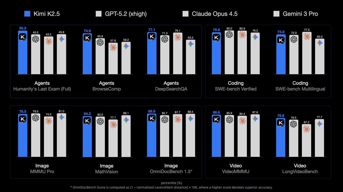 Moonshot представили Kimi K2.5 - это полноценный визуальный агент, заточенный под сложные задачи, код и мультимодальность. Что по бенчмаркам 🔹 Глобальный SOTA на агентных тестах - HLE full set - 50.2% - BrowseComp - 74.9% 🔹 Open-source лидер по зрению и коду - MMMU Pro - 78.5% - VideoMMMU - 86.6% - SWE-bench Verified - 76.8% Фишка, которая выделяет K2.5 🎨 Code with Taste — модель превращает чаты, изображения и видео в эстетичные сайты с анимацией и выразительным движением, а не просто сухой HTML. 🤖 Agent Swarm (Beta) Самонаправленные агенты, работающие параллельно: - До 100 суб-агентов - До 1 500 вызовов инструментов - До 4.5x быстрее по сравнению с одиночным агентом Это уже ближе к распределённой системе ИИ-исполнителей, чем к одному «умному боту». Где попробовать 🥝 K2.5 доступен на http://kimi.com - Chat mode - Agent mode 🥝 Agent Swarm — бета для пользователей высокого уровня 🧑💻 Для продакшн-разработки можно связать с Kimi Code https://kimi.com/code Для разработ