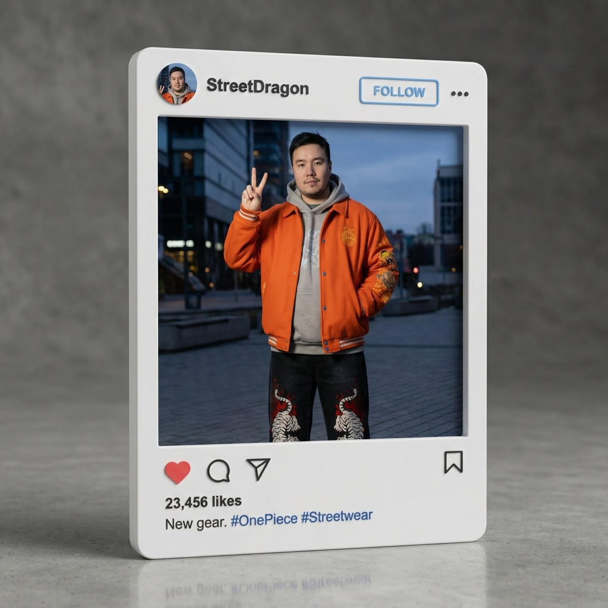 но че-т понравилось Грузите фотки одежды и человека в гпт или другую ллм и просите отредактировать этот промпт Create a hyper-realistic, cinematic Instagram post layout where the Instagram UI exists as a physical, tangible 3D object, photographed like a premium commercial product shot. The result should feel indistinguishable from a real studio photograph. Instagram Frame (UI Accuracy – Critical): Authentic Instagram interface rendered as a solid white physical 3D card Smooth matte plastic surface with subtle micro-texture Slight thickness visible on edges, realistic bevels Perfectly rounded corners (exact Instagram radius) Soft studio reflections and realistic edge highlights Top Bar (Pixel-accurate UI): Circular profile avatar on the left Username text: "StreetDragon" in Instagram's default bold UI font Light blue FOLLOW button with correct proportions Three-dot menu icon aligned to the far right Exact spacing, typography, and icon sizing matching the real Instagram app Aspect rati