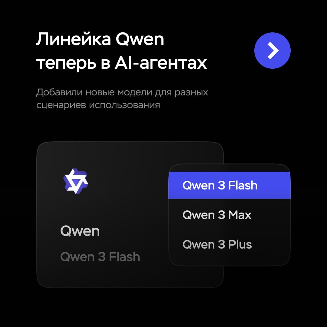 🫷🏻 Теперь при создании агента доступны три актуальные модели с разными сценариями использования. 1️⃣ Qwen-Flash. Быстрые ответы + минималка по цене. Идеально для чатов, автоворонок, поддержки и простых агентных сценариев. 1 млн токенов — 45 ₽ в месяц. 2️⃣ Qwen-Plus. Скорость + качество ответов. Подходит для бизнеса, ассистентов и задач, где важен контекст. 1 млн токенов — 140 ₽ в месяц. 3️⃣ Qwen-Max. Имеет максимальные возможности среди всей линейки. Для сложных запросов, длинных диалогов и документации. 1 млн токенов — 660 ₽ в месяц. Пока модели не поддерживают функцию рассуждения, но мы скоро это исправим. Пока можете тестировать и обновлять коллекцию агентов →