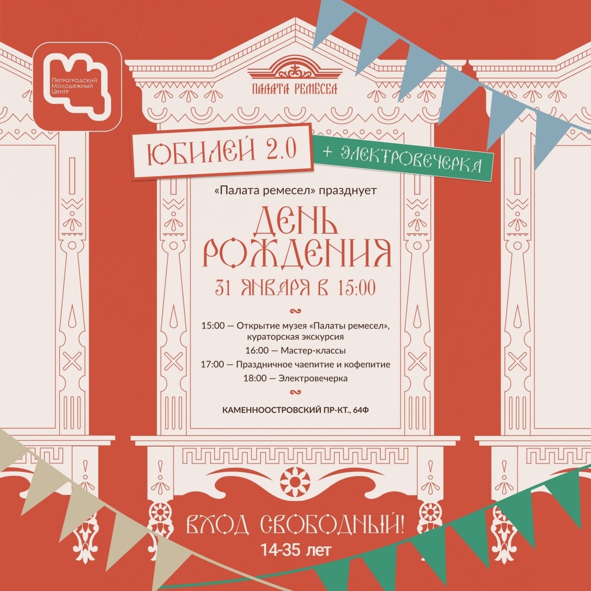 ⭐️ Регистрация на юбилей: clck.ru/3RQfiR и clck.ru/3RQfih ⭐️ Регистрация на Электровечёрку: clck.ru/3RQfiu и clck.ru/3RQfjT Друзья, у нас большая новость! 31 января «Палата ремесел» отметит свой 5-летний юбилей грандиозным праздником! За пять лет мы стали настоящей точкой притяжения. Здесь прошли уникальные мероприятия: фестивали, концерты, вечёрки и выставки. На мастер-классах родились сотни уникальных изделий, а стены наполнились сотнями наигрышей и песен. Главный подарок — вам и нам — открытие Музея «Палаты ремесел». Эта экспозиция — живой итог пятилетнего пути. Мы приглашаем увидеть народную культуру не за музейным стеклом, а в реальности. Вас ждет торжественное открытие Музея, кураторская экскурсия и мастер-классы. 🎉 А в финале вечера зажжем под уже полюбившуюся всем «Электровечёрку»! 🎉 📍Мероприятие бесплатное. Возраст участников: от 14 до 35 лет. Не забудьте взять сменную обувь! 📍 Адрес: ст.м. Петроградская, ст.м. Черная речка, Каменноостровский пр-т, 64 Ф, МП «Палата рем