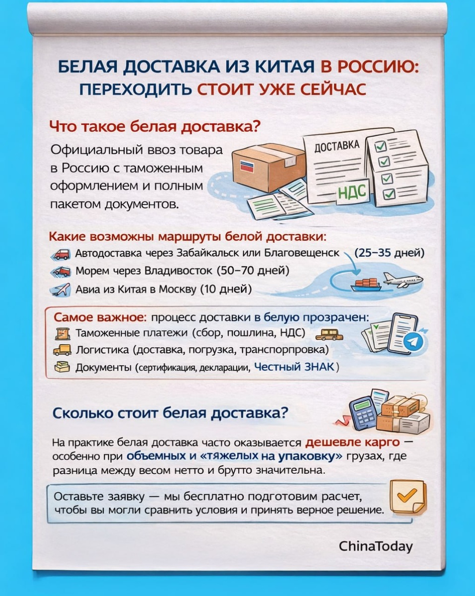Серые схемы ввоза постепенно теряют актуальность. Бизнесу все важнее предсказуемость, безопасность и легальность. И все чаще предприниматели переходят на белую доставку из Китая — с официальной растаможкой, документами и возможностью работать в открытую. В этом материале подробно разбираем: какие есть маршруты, какие документы потребуются, как формируется цена и в каких случаях белая схема действительно выгоднее. Белая доставка — это легальный ввоз товаров с прохождением всех необходимых процедур на границе: Это не просто «законно». Такая схема импорта позволяет: По сути, вы получаете легальный, документально подтвержденный товар, с которым можно спокойно масштабировать бизнес. 1. Автодоставка через Забайкальск или Благовещенск (25–35 дней)