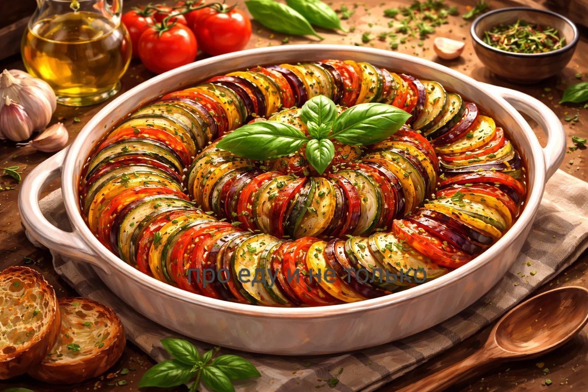Рататуй в запечённом варианте это уже не просто овощное рагу, а эффектное и по-настоящему ресторанное блюдо. Тонко нарезанные овощи, аккуратно выложенные слоями и запечённые на ароматной томатной подушке, выглядят очень красиво и при этом сохраняют насыщенный вкус каждого ингредиента. Ингредиенты: Томатная подушка: Лук очистите и мелко нарежьте Чеснок нарежьте тонкими пластинками. Обжарьте лук до мягкости, добавьте чеснок и прогрейте несколько секунд. Помидоры нарежьте кубиками добавьте к луку и чесноку. (я еще добавил небольшое количество запеченного и очищенного болгарского перца, но это необязательно) Посолите, поперчите, добавьте приправы и тушите 7-10 минут Пробейте соус блендером до однородной консистенции Готовый соус равномерно распределите по дну формы для запекания. Подготовка овощей: Баклажан, кабачок и болгарский перец нарежьте тонкими кружочками одинаковой толщины. При необходимости баклажан можно слегка подсолить и оставить на 10 минут, затем промыть и обсушить.