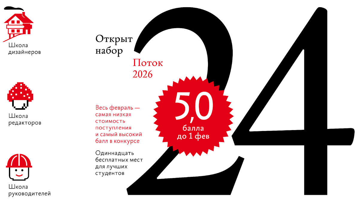 Открыт набор в 24 поток Школы дизайнеров, Школы редакторов и Школы руководителей. Сейчас лучшее время для поступления: до конца февраля стоимость обучения в Школах бюро минимальная, а шансы выиграть конкурс на бесплатное место максимальные. Стоимость обучения в Школах бюро постоянно растёт, а оценка за срок в конкурсе на бесплатное место постоянно снижается с открытия набора и до точки невозврата потока. Сейчас в школах учится 212 студентов 22 и 23 потоков из 78 городов и 15 стран. За их успехами мир следит на страницах школ. План дистанционного обучения рассчитан на целый год. В школах обучают типографике, вёрстке, проектированию интерфейса, редактуре, визуализации, управлению проектами, переговорам, работе с клиентом, дизайну продуктов, аналитике и маркетингу. На первой ступени дизайнеры, редакторы и руководители осваивают теорию; на второй решают практические задачи в двухнедельных итерациях; на третьей лучшие студенты работают в кроссдисциплинарных командах с преподавателями над ди