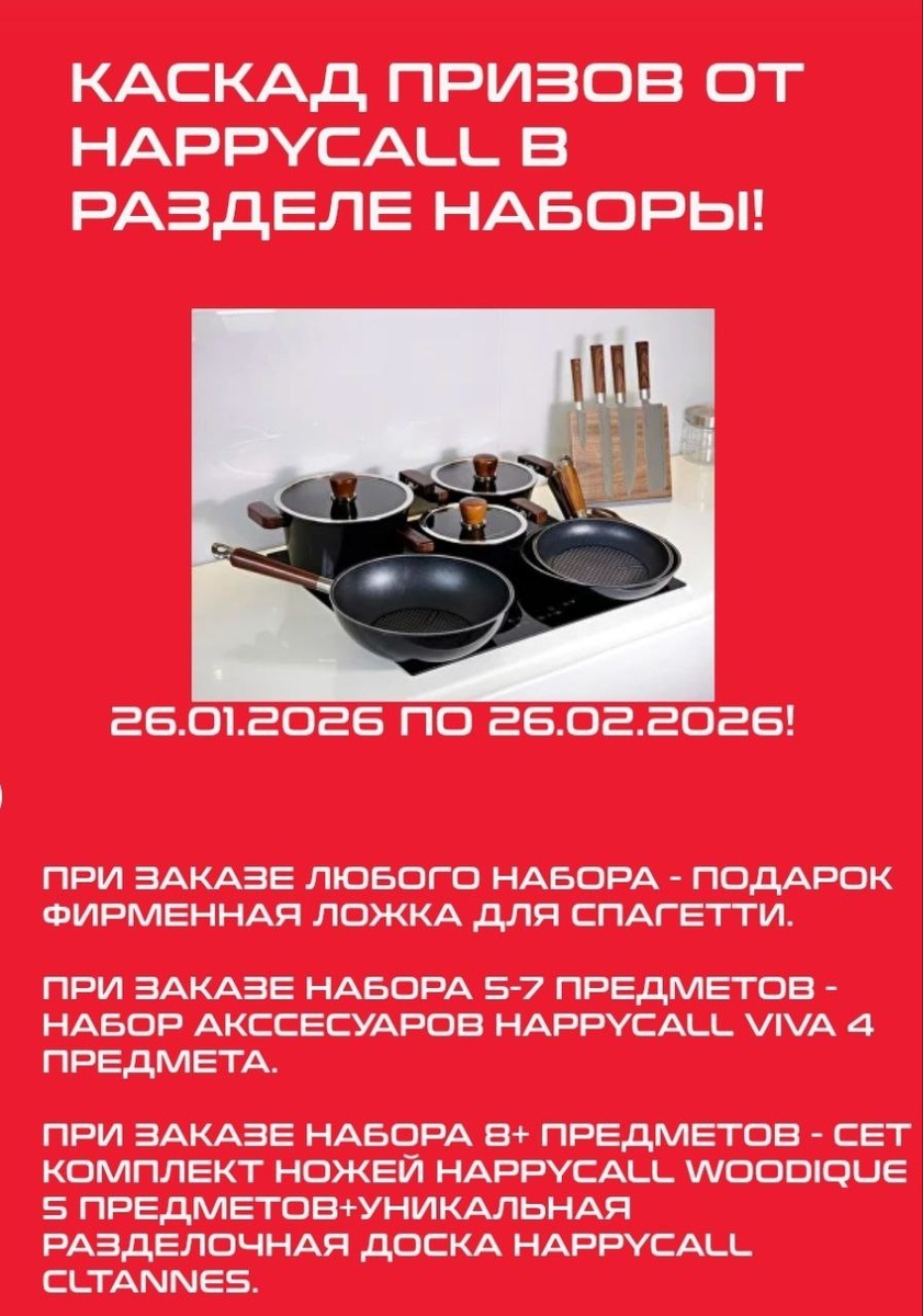 🍳🔥 С 26.01.2026 по 26.02.2026🔥 Информируем , что если у вас в заказе любой комплект из раздела Наборы, то вы автоматически получаете приз - фирменная ложка для спагетти Happycall Edge. . Если набор 5-7 предметов - приз набор аксессуаров Happycall Viva 4 предмета 😍 . А если набор 8+ предметов - приз сет набор ножей Happycall Woodique 5 предметов+ уникальная разделочная доска Happycall Cleanness 🔥 . Таким образом, чем больше комплект, тем больше приз! . На сайте в разделе Наборы собранные выгодные комплекты уже со скидкой до 20%. Приятных покупок 😍