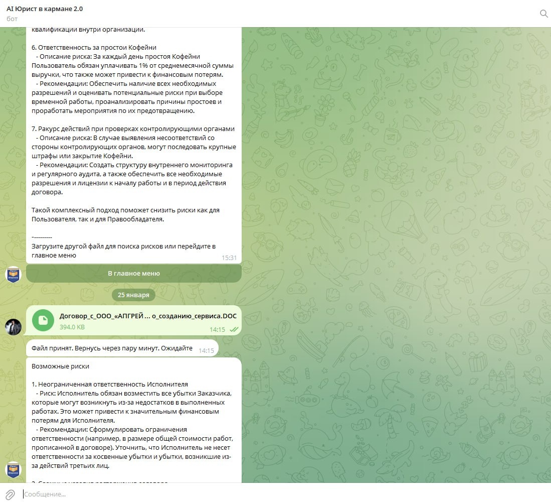 Загружаете файл (PDF, DOCX или RTF) — в ответ получаете понятные рекомендации, на какие пункты обратить особое внимание и что уточнить у контрагента. 👨💻 Приглашаю на бета-тест — @ai_urist_2_ovg_bot Краткая инструкция: 0) Проверьте, чтобы у вашего аккаунта был никнейм (имя пользователя с @, иначе работать не будет) 1) Запустите бота @ai_urist_2_ovg_bot 2) Напишите код 4815162342, который активирует 10 бесплатных проверок 3) Нажмите на "Главное меню". Затем на кнопку "Риски" или "Противоречия" 4) Загрузите проект договора (файл doc, docx, rtf) и через 1-2 минуты даст результат. Если что то не работает, напишите мне, разберёмся. Сервис не заменяет профессиональную юридическую консультацию. Это быстрый «первый фильтр», чтобы экономить время и не пропускать неприятные нюансы. Представьте, контрагент прислал объёмный договор «на подпись к утру». В тексте — юридические формулировки, ссылки на приложения и пункты, которые легко упустить. Нужно быстро понять риски и подготовить список в