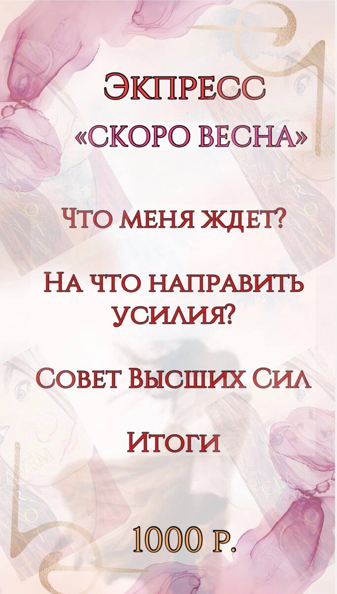 Дорогие, вот и подходит к концу первый месяц 2026 года, до праздников еще далеко, а сердце жаждет перемен, теплых деньков и весеннего настроения🌸🍯💗 Предлагаю вашему вниманию Расклад-Акцию для тех, кто хочет услышать что-то важное. Если хотели на расклад, но не решались, возможно, наступил тот самый момент. Обнимаю, ваша tarotclavem❣ Написать мне: ✨телеграмм http://t.me/tarot_clavem ✨IMO 89147046626 ✨MAX 89147046626