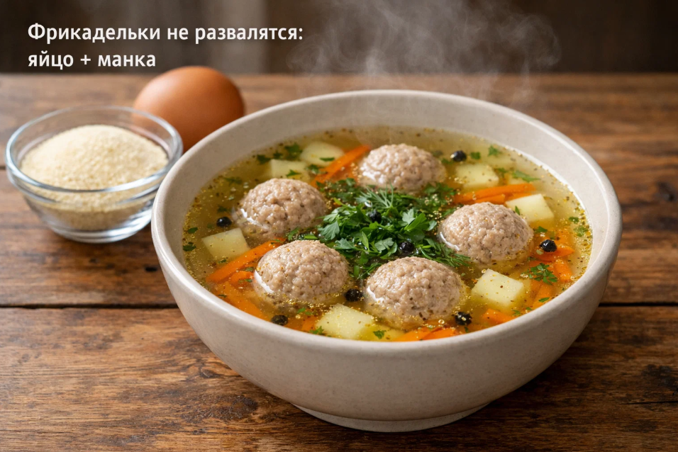Существует проверенный временем способ решить проблему разваливающихся фрикаделек раз и навсегда. Достаточно добавить в фарш два простых ингредиента — куриное яйцо и столовую ложку манной крупы. Этот приём использовали ещё наши прабабушки, и он работает безотказно.