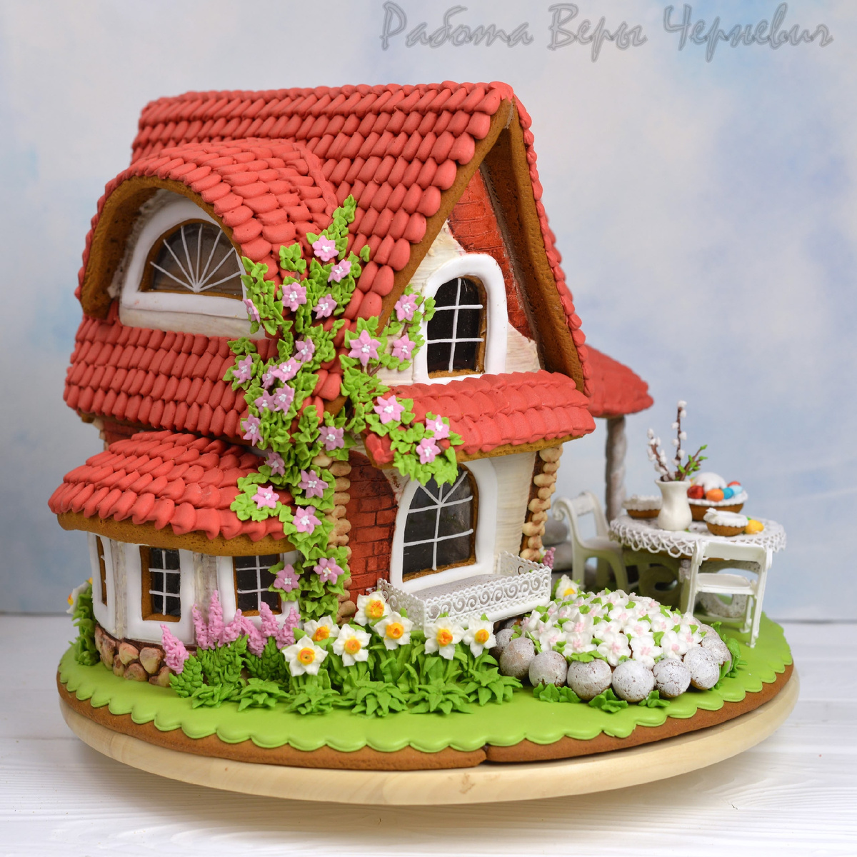 🏡Домик сделан с наклонными стенками, крылечком, изогнутыми крышами и множеством деталей.