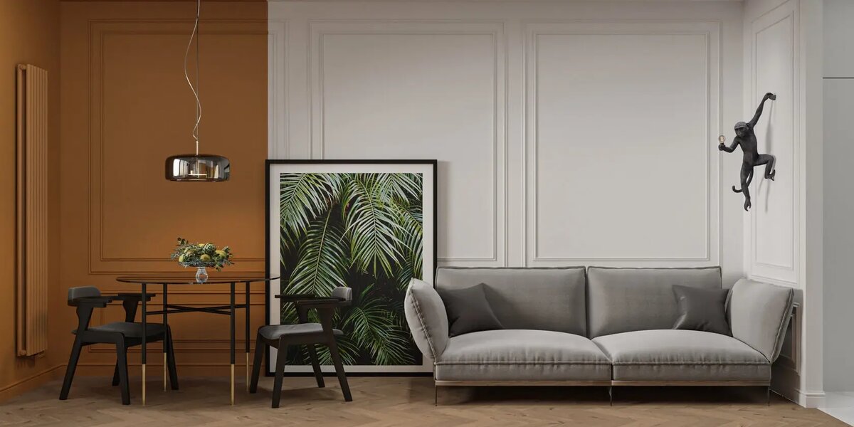 Хороший интерьер с тропическими вайбами не выглядит как тропики буквально. Он скорее ощущается как тропики. В нём нет необходимости доказывать стиль пальмами на каждом шагу, потому что тропический стиль живёт в другом. В тепле воздуха, в мягком свете, в цветах, которые напоминают песок и листву, в спокойствии, которое обычно приходит только в отпуске. В нашем случае интерьер начинается с чувства простора. Меньше визуального шума, больше ровных плоскостей, понятная геометрия, аккуратный порядок. Современность здесь нужна не ради моды. Она работает как рамка, которая не даёт «тропикам» превратиться в декорации. Тропическое настроение часто держится на песочных оттенках. Это фон, который делает помещение. Песок, карамель, мёд, топлёное молоко, тёплый беж. Эти цвета создают ощущение солнца на стенах. А зелень в нашем интерьере не работает по принципу «поставим побольше растений». Зелень здесь больше про образ. Про тень от листьев, про ощущение сада за стеной, про знакомые силуэты листвы. П
