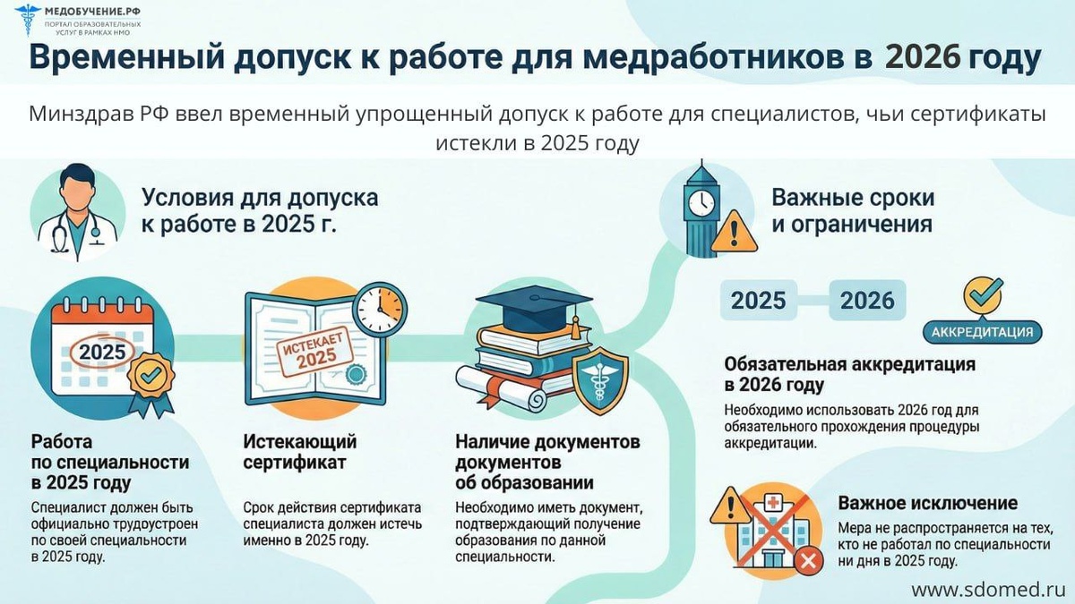 ! Минздрав РФ утвердил приказ о временном упрощённом допуске специалистов к работе без прохождения периодической аккредитации. Речь идёт именно о временной мере, а не об отмене требований. Согласно приказу, продолжить работу в 2026 году без периодической аккредитации могут специалисты, которые одновременно соответствуют следующим условиям: – работали по своей специальности (в должности) в 2025 году – имеют документ об образовании и (или) квалификации по данной специальности – для медицинских и фармацевтических работников — имеют сертификат специалиста, срок действия которого истёк именно в 2025 году – для специалистов с иным образованием (биологи, медицинские психологи и др.) — их образование соответствует требованиям приказа Минздрава РФ № 206н от 02.05.2023, приказа Минздравсоцразвития РФ № 541н или действующим профстандартам Важно понимать ключевой момент: это НЕ освобождение от аккредитации, а ОТСРОЧКА. Все специалисты, воспользовавшиеся этим послаблением, обязаны пройти пери