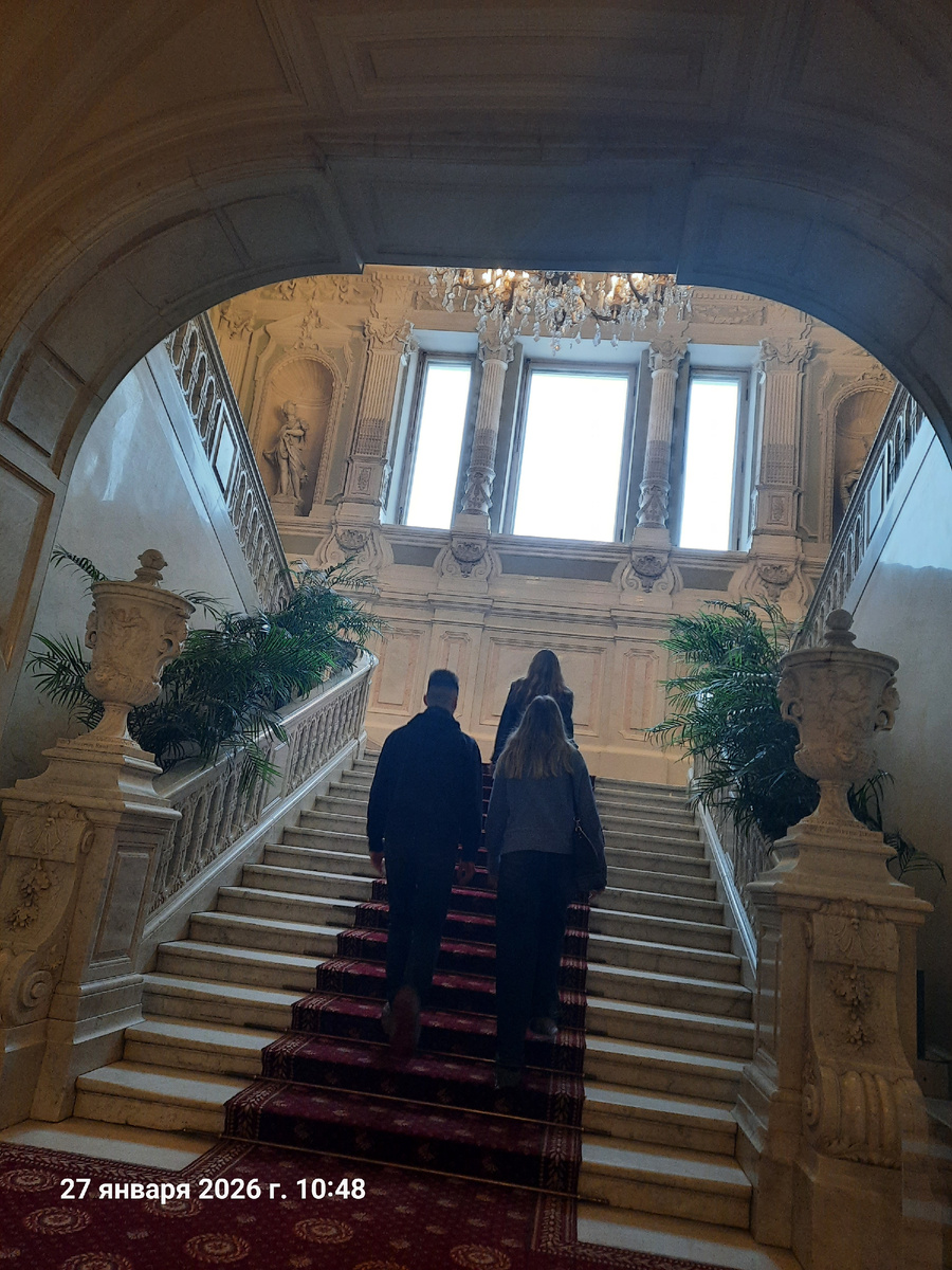 Парадная лестница! Она сделана из карарского мрамора во Франции, привезена и собрана здесь. В нишах статуи частей света.