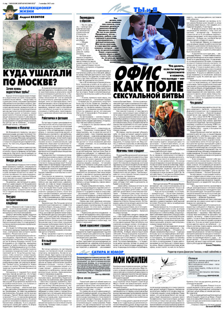 Юмор в жизни людей востребован всегда, по утверждениям медиков-психологов улыбки и смех продлевают жизнь. К сожалению, и сатира жива, во все века есть люди, совершающие поступки, достойные высмеивания. Мастером сатиры и юмора является академик ИАСК Обухов Евгений Алексеевич, чьи произведения, продолжая быть актуальными, часто публикуются в СМИ. Очередная публикация была сделана в «Московском комсомольце» от 03.10.25.