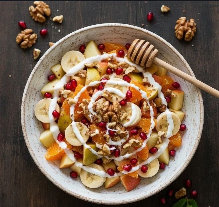 ⏱10 минут | 95 ккал(100 г) 🛒Что нужно: 🍎Яблоко сладкое — 1 шт. 🍐Груша сочная — 1 шт. 🍌Банан — 1 шт. 🍊Мандарин — 2 шт. 🥜Грецкие орехи — 30 г 🥣Греческий йогурт или мед — 2 ст.л. 🍋Лимонный сок — 1 ч.л. 👩🍳Как готовить: Очистите фрукты от кожуры и семян. Яблоко, грушу и банан нарежьте аккуратными кубиками, а мандарины разберите на дольки (крупные можно разрезать пополам). Сбрызните яблоко и грушу лимонным соком, чтобы они не потемнели. Смешайте все фрукты в миске, добавьте измельченные орехи. Заправьте йогуртом или жидким медом и сразу подавайте к столу.