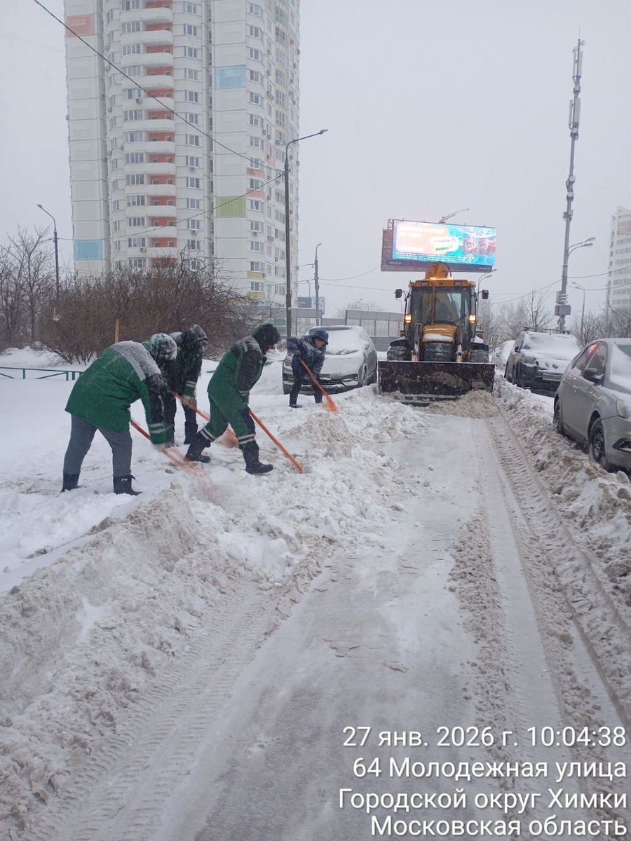 Дворники и специализированная техника очищают улицы и дворы Химок от снега. Уборка продолжится во всех микрорайонах округа до полного устранения последствий циклона.