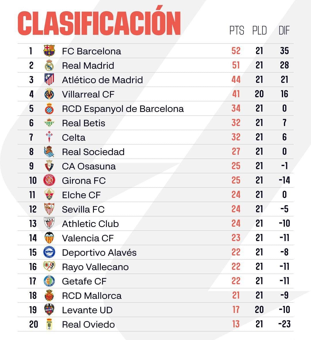 🇪🇸 Турнирная таблица LALIGA после 21-го тура